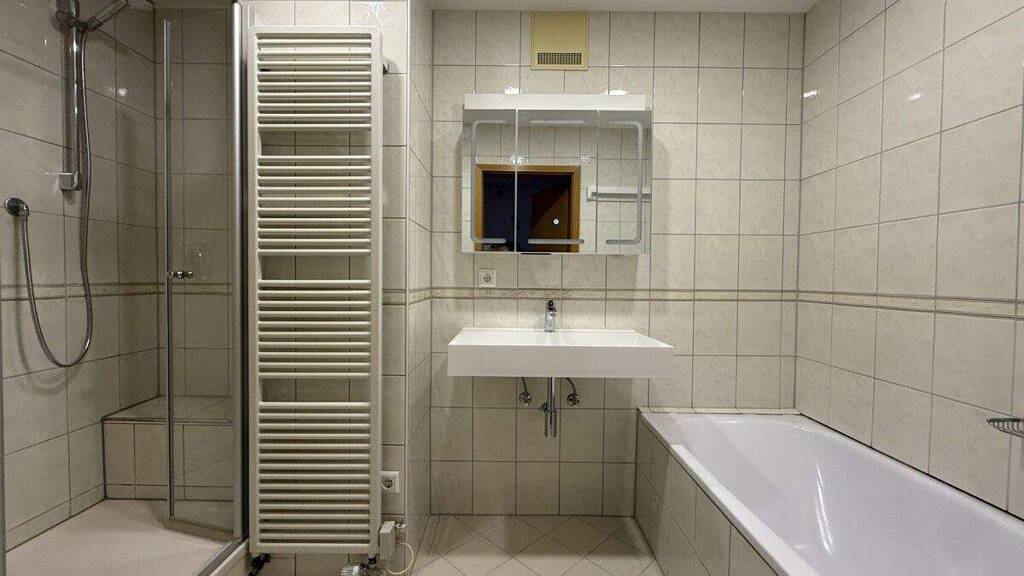 Das Badezimmer ist mit Dusche, Badewanne und Handwaschbecken ausgestattet. Ergänzend steht ein separates WC mit eigenem Handwaschbecken zur Verfügung, was zusätzlichen Komfort im Alltag schafft. In den Wohnräumen wurden Parkett- und Vinylböden verlegt, während die Nassbereiche mit Fliesen ausgestattet sind - eine stilvolle und zugleich pflegeleichte Kombination.