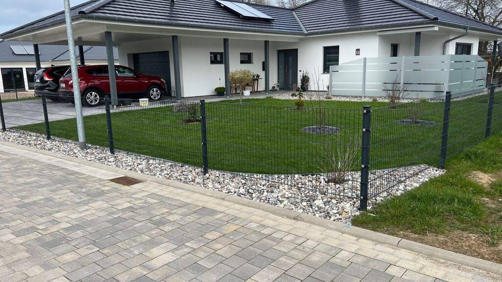 Wir haben das, was Sie suchen! Das hier angebotene und im Jahr 2020 in Massivbauweise errichtet Einfamilienhaus im Bungalowstil besticht duch seinen modernen und klaren Baukörper und die betont schlichte Farbgestaltung. Stahlend weißer Außenputz trifft auf eine anthrazitfarbene Ziegeldacheindeckung. Im gleichen dunklen Farbton sind auch Türen, Fenster und die Stützen, die den Dachüberstand halten, gestaltet. Auch die auf dem Grundstück befindlichen Brennholzregale, die den Holznachschub für den im Wohnzimmer installierten Kamin beherbergen, der Gartenpavillon und sogar der Zaun sind in diesem Farbton gehalten, was das ganze Bauensemble sehr elegant erscheinen lässt.