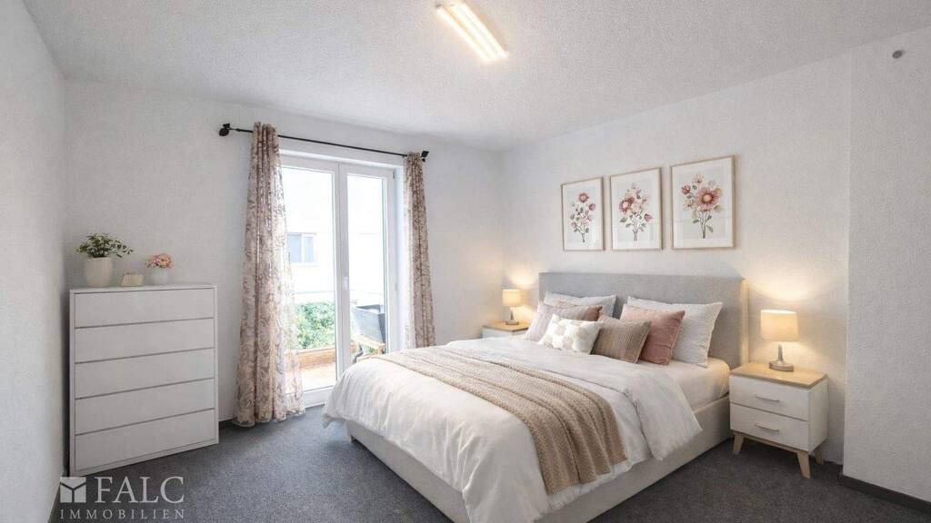 Das Schlafzimmer ist großzügig geschnitten und verfügt ebenfalls über einen Zugang zum Balkon. Ergänzt wird das Raumangebot durch ein geräumiges Badezimmer.