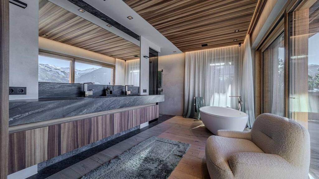 Ein weiteres Highlight ist die luxuriöse Master-Suite mit separater Ankleide. Das großzügige Badezimmer en suite mit freistehender Badewanne sowie der direkte Zugang zur Sonnenterrasse schaffen perfekte Voraussetzungen für Erholung und Rückzug in absoluter Privatsphäre. Hochwertigste Materialien wie Altholz in Kombination mit Naturstein, eine trendbewusste Ausstattung mit italienischen Designermöbeln, maßgefertigte Tischlereinbauten in Eiche sowie ausgewählte, edle Stoffe vereinen feinsten Luxus mit den klassischen Elementen der Tiroler Architektur.