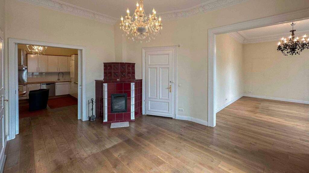 Der zweiachsige Vorbau mit Doppelflügeltür führt in repräsentative Wohnräume, die eine ideale Verbindung von klassischem Ambiente und zeitgemäßer Nutzung schaffen. Ein modernes Esszimmer mit Anschluss an den Hauswirtschaftsraum verbindet die offene Wohnküche, die mit modernen Geräten ausgestattet ist, mit dem großzügigen Wohnzimmer.
