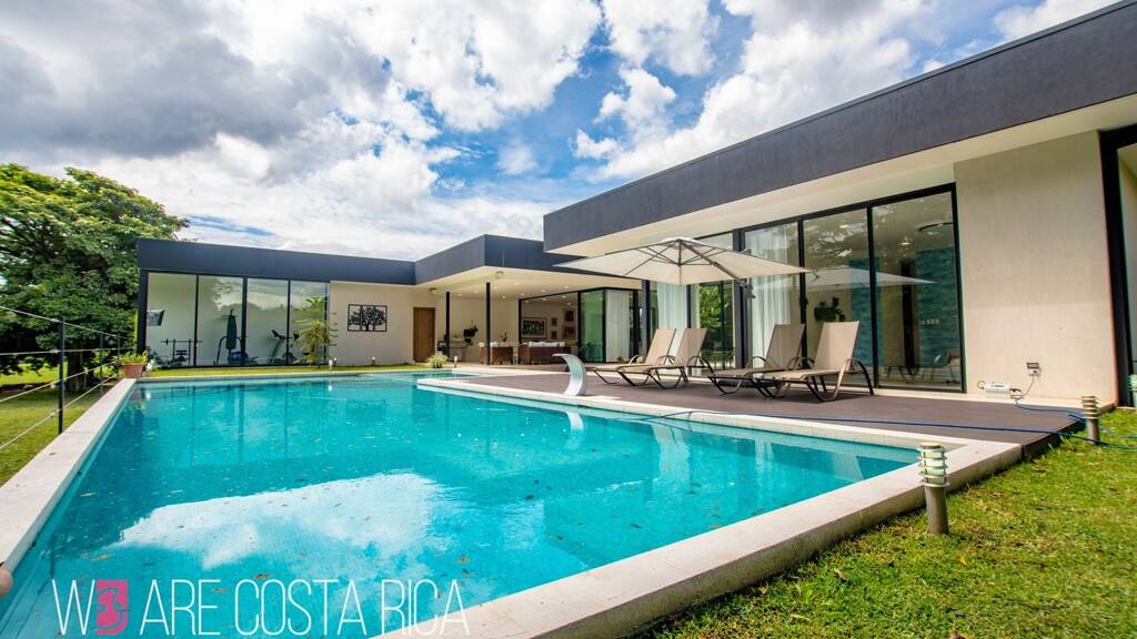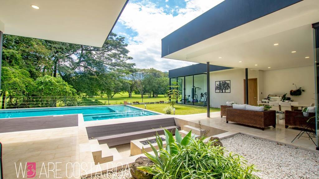 Welcome to the epitome of luxury and modernity in this stunning single-level residence in the distinguished Valle del Sol condominium, Santa Ana. This recently constructed masterpiece, with 940 square meters of construction and 1,780 square meters of land, has been designed following the principles of Feng Shui to bring balance and harmony to every corner. Immerse yourself in a space filled with natural light, thanks to floor-to-ceiling windows that offer panoramic views of the beautiful surrounding gardens. High ceilings and marble floors add a sense of spaciousness and elegance to every step. The integrated kitchen, living room, and dining room create a fluid and comfortable atmosphere. Inside the house, you'll discover four spacious rooms, each with a walk-in closet and a full bathroom, providing an oasis of luxury and privacy. The master bedroom is a unique experience with a steam bath, shower, separate double toilet, and an internal room designed for maximum relaxation. Comfort is amplified with five full bathrooms and 2 half guest bathrooms, ensuring a perfect space for your guests. The office, ideal for working from home, is an inspiring and functional space. The kitchen is equipped with built-in furniture, granite countertops, and state-of-the-art luxury appliances, ensuring an exceptional culinary experience. The pantry provides additional space to store your provisions, and the custom shelving and indoor garden add a touch of nature to the interior. Entertainment is guaranteed with the game room and cinema, where you can enjoy movie nights in the comfort of your home. Maintain an active lifestyle with the gym and relax in the heated pool and jacuzzi. A fire pit adds a cozy touch to your outdoor nights. In addition, the property features space for 8 cars, a service room, air conditioning in all rooms and social areas, and smart lights for easy lighting control, complying with Law 7600. Enjoy the condominium's amenities, such as a pool, BBQ area, indoor tennis courts, golf course, 24/7 security, and controlled access. All of this in an environment with a warm climate and close to shopping centers, restaurants, and the main routes to the Pacific beaches of Costa Rica. This property is more than a house; it's an exclusive lifestyle awaiting you!