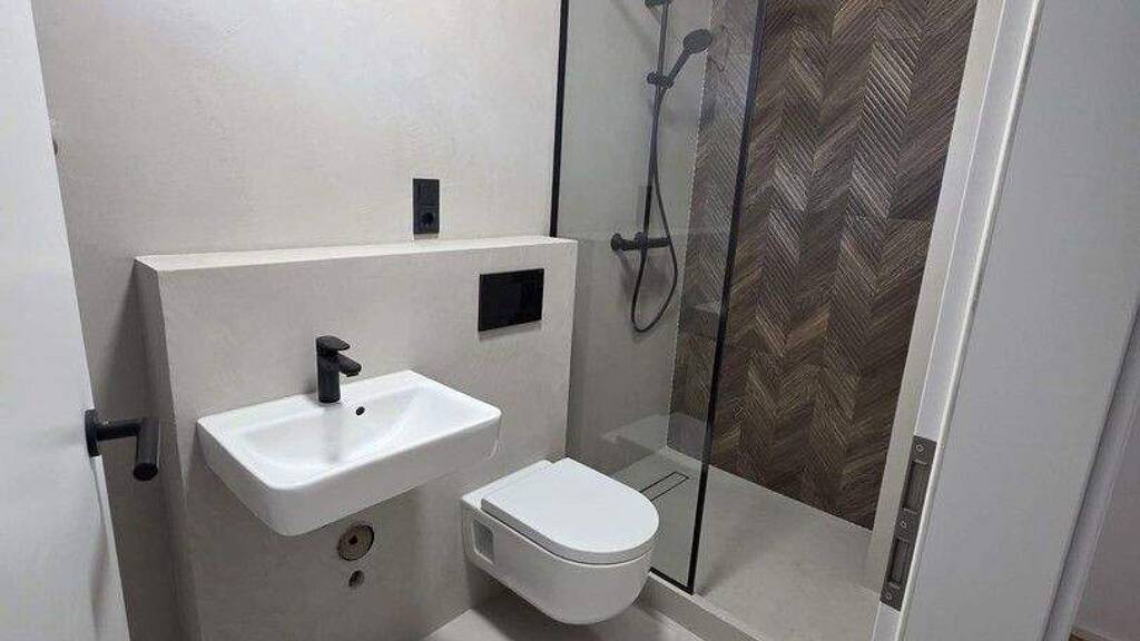 Das moderne Badezimmer ist stilvoll gestaltet und verfügt über eine bodengleiche Walk-In-Dusche, hochwertige Armaturen sowie eine harmonische Kombination aus hellen Materialien und modernen Akzenten.