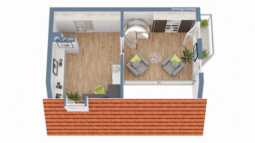 Über eine Wendeltreppe gelangt man in das Obergeschoss der Wohnung mit dem Kinder- bzw. Arbeitszimmer. Auf der offenen Galerie kann man einen gemütlichen Platz für einen Spiel- oder Lounge-Bereich einrichten. Vom Balkon aus mit Blick Richtung Westen, kann man die tolle Aussicht zur Pfarrkirche St. Laurentius genießen.