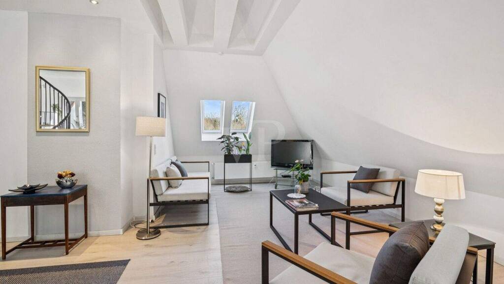Die Dachgeschosswohnung beeindruckt durch ihren offenen Studiocharakter mit raumhohen Decken und sichtbarem Gebälk. Der offene Grundriss integriert die Einbauküche und schafft helle, großzügige Wohnbereiche. Zusätzlich stehen ein separates Schlafzimmer, ein Badezimmer mit Dusche sowie ein Abstellraum zur Verfügung. Eine weitere Ebene bietet flexible Nutzungsmöglichkeiten, beispielsweise als zusätzlicher Schlafbereich.