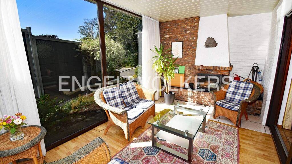 Ein besonderer Höhepunkt ist die ehemalige Loggia mit Kamin, die zu einem modernen "Wintergarten" umgebaut wurde. Dieser Raum lädt dazu ein, sich auch an kühleren Tagen am Kaminfeuer zurückzuziehen und den Ausblick auf den liebevoll gestalteten Garten zu genießen. Neben der ca. 40 m² großen Terrasse finden Sie im Garten eine Rasenfläche mit Gartenhaus und einen großen, idyllisch angelegten Teich.