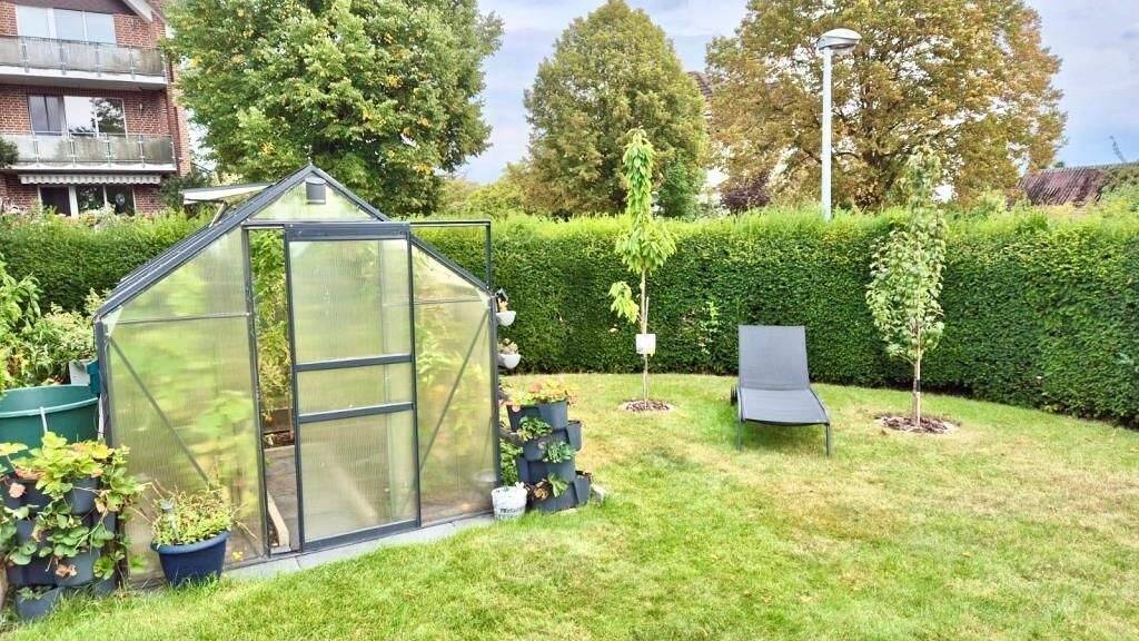 Über eine Diele sind die drei Zimmer, Küche und Vollbad zu erreichen, im hinteren Flur befindet sich eine Garderobe. Warmwasser wird dezentral über Durchlauferhitzer erzeugt, so bleiben die Heizkosten im Rahmen. Der Gartenanteil der Wohnung ist zur Nachbarseite etwas abgetrennt, schön ruhig und nach Süden gerichtet.