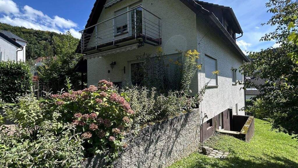 Neben dem Haus steht eine geräumige Garage mit direktem Zugang ins Untergeschoss, so gelangen Sie auch bei Regen trockenen Fußes ins Haus. Vor dem Gebäude befindet sich ein weiterer Stellplatz. Der Haupteingang ist über eine Außentreppe erreichbar.