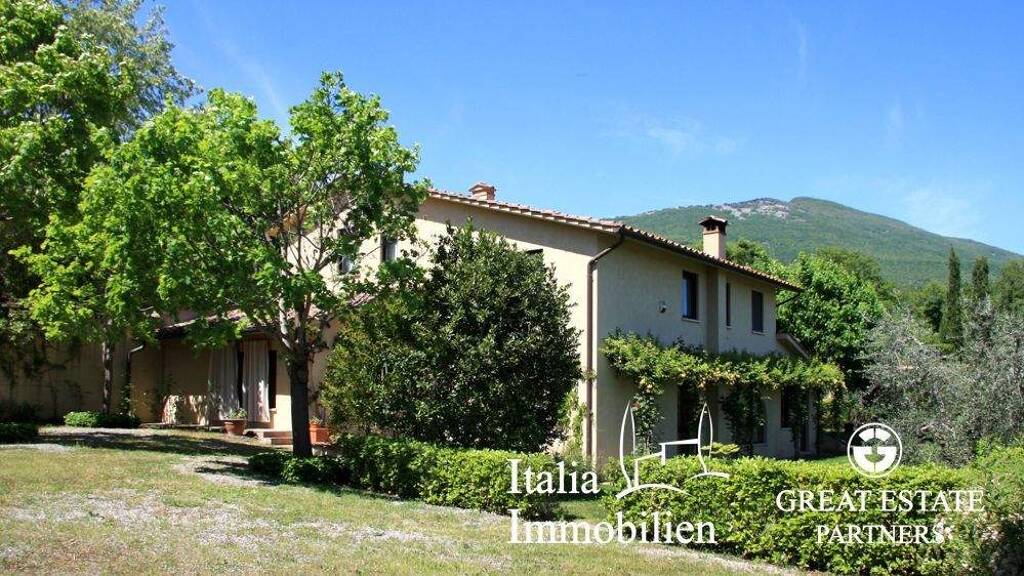 In der Gemeinde Cetona, eingebettet in die üppige toskanische Landschaft, erwartet Sie diese elegante, aufwendig restaurierte Villa mit ca. 360 Quadratmetern Wohnfläche inmitten eines 2.800 Quadratmeter großen Privatparks und einem bezaubernden Panoramablick über das Tal. Die Villa besticht durch geschmackvolle und helle Innenräume: Im Erdgeschoss befinden sich ein doppeltes Wohnzimmer, ein Arbeitszimmer, eine geräumige Küche und ein Schlafzimmer mit privatem Bad. Das Obergeschoss beherbergt den Schlafbereich mit drei Schlafzimmern, jeweils mit eigenem Bad, und einem zusätzlichen Wohnzimmer mit separatem Außenzugang. Zur Immobilie gehört ein wunderschöner, 11 x 6 Meter großer Panoramapool mit Blick auf die Landschaft. Darüber hinaus umfasst das Grundstück 5,47 Hektar Land mit einem Olivenhain, Wald und Ackerland.