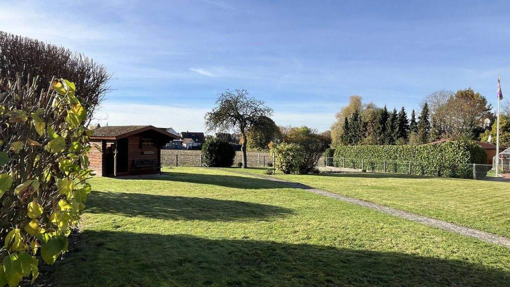 Das Grundstück bietet eine Garage, ein Carport mit Geräteschuppen, einen großen Hof, eine überdachte Terrasse und ein Gartenhaus. Der Garten ist pflegeleicht gestaltet und lädt zum Entspannen ein.