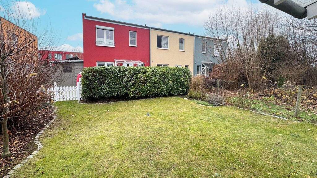 Dieses gepflegte farbenfrohe Reiheneckhaus aus dem Jahr 2007 bietet auf einer Wohnfläche von ca. 95m² ausreichend Platz für individuelles Wohnen. Mit vier Zimmern, darunter drei Schlafzimmer, eignet es sich optimal für kleine Familien oder Paare. Ein modernes Tageslichtbad mit Dusche und Badewanne rundet den Wohnkomfort ab. Die wertige Einbauküche im Landhausstil ergänzt den skandinavischen Charakter des Hauses, ebenso der stilvolle Parkettboden im Wohnbereich. Ein praktischer Wasch- und Trockenraum mit Lagerfläche ist im OG ebenfalls vorhanden. Das Grundstück umfasst 203 m² und bietet mit zwei überdachten, windgeschützten Terrassen zusätzlichen Raum für Erholung im Freien. Ein kleiner Schuppen gehört ebenfalls zum Außenbereich.