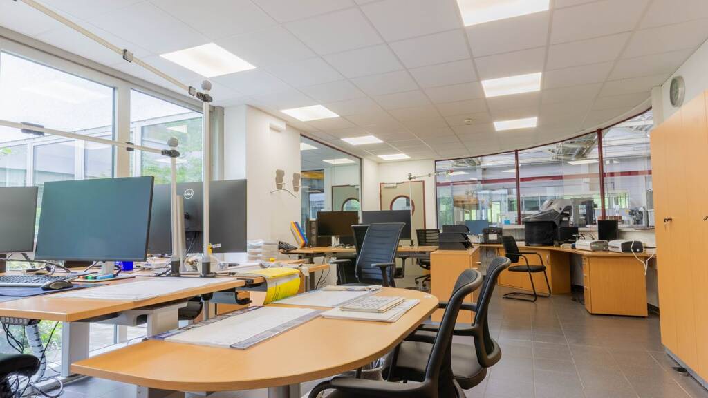 Das zweigeschossige Bürogebäude schließt sich an der Nord- und Westseite an. Die Büroräume sind entlang eines zentralen Mittelgangs organisiert, der zugleich als Besprechungs- und Funktionszone dient. Einzel- und Kombibüros liegen beidseitig entlang dieses Atriums, das durch großflächige Verglasungen natürliche Belichtung und Belüftung ermöglicht. Im Eingangsbereich befindet sich eine Musterausstellung, die direkt nach Betreten des Gebäudes sichtbar ist. Weitere Räume wie eine Teeküche, Lager, Plotterraum sowie ein separater Besprechungsraum ergänzen den funktionalen Verwaltungsbereich.