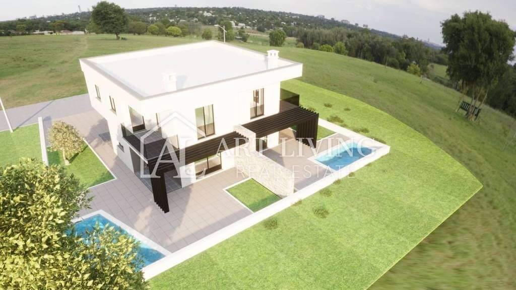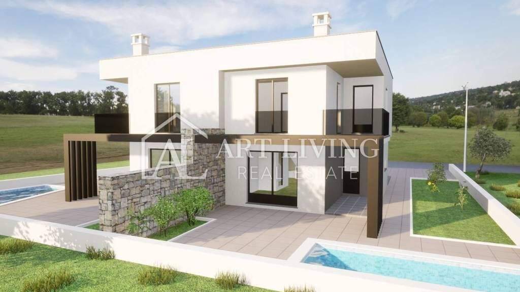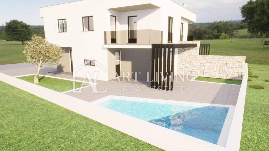 Eine Doppelhaushälfte mit Pool in einem modernen Neubau steht zum Verkauf. Die Villa liegt 3.500 m vom Zentrum von Umag und dem Meer entfernt und bietet einen herrlichen Blick auf die Umgebung und die Landschaft.