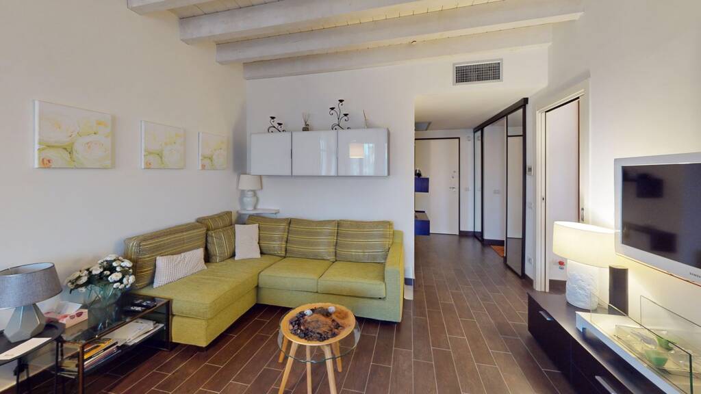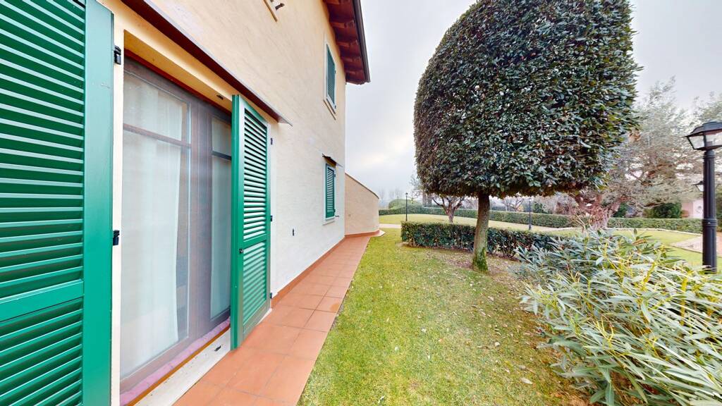 Dreizimmerwohnung mit privatem Garten und Terrasse im Garda Resort Village - I Borghi di Bassana, einer prächtigen, von Grün umgebenen Residenz mit Swimmingpools, einem Restaurant und einem breiten Angebot an Sport- und Freizeiteinrichtungen.