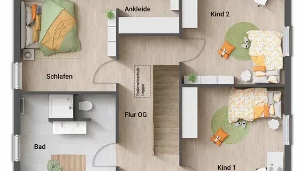 Auch das Obergeschoss zeigt sich im gradlinigen Baustil des Hauses. Hier finden Sie drei Zimmer, die Sie nach Ihren Vorstellungen als Schlaf-, Kinder- oder Gästezimmer nutzen können. Große Fenster lassen auch hier viel Tageslicht hineinströmen. Die Ankleide im Schlafzimmer bietet viel Stauraum.