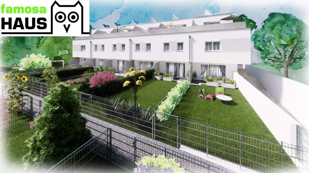 Energiespar-Reihenhaus mit 130m² Wohnfläche, 44m² Keller, Dachterrasse, Eigengrund und Garagenplatz.