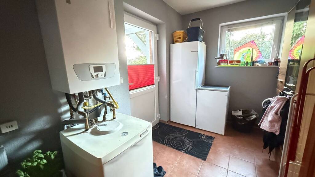 Die Beheizung erfolgt über eine Erdgasheizung mit Rücklauferwärmung im Wohnzimmer, in der Küche, im Bad sowie in der Diele. Kunststofffenster mit 2-fach-Isolierverglasung sorgen für eine solide energetische Basis. Eine Garage mit elektrischem Garagentor rundet das Angebot praktisch ab.