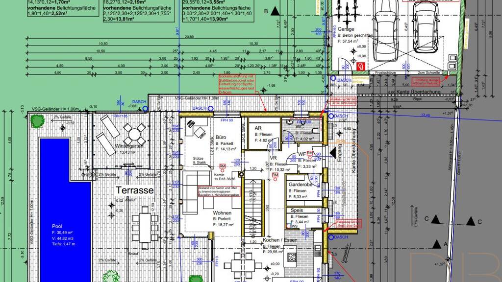 * Garage: ca 60 m², inkl. Starkstromanschluss für Elektroautos