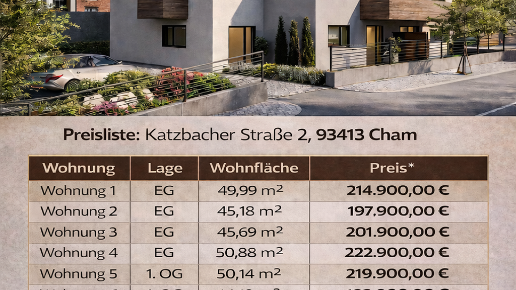 Entdecken Sie dieses ansprechende 2-Zimmer-Apartment in bester Lage von Cham. Dieses moderne Wohnobjekt, das neu erbaut wurde, ist perfekt für Singles oder Paare und erstreckt sich über 44,23 m². Die charmante Einheit befindet sich im 1. Stock eines eleganten 2-stöckigen Gebäudes, das im Jahr 2026 erbaut wurde und mit einem Aufzug erreichbar ist.