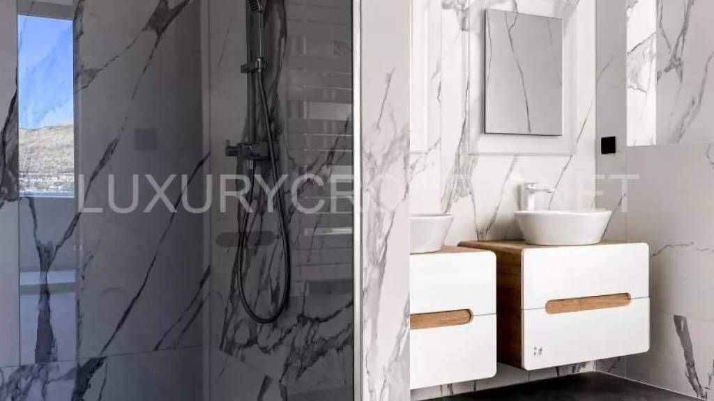 Den atemberaubenden Blick auf das Meer und die gegenüberliegende Küste können Sie von der Terrasse aus genießen, die mit einem 11 Meter langen beheizten Pool ausgestattet ist. Dank der raumhohen Aluminium-Panoramafenster bleibt dieser einzigartige Ausblick auch dann vor Augen, wenn Sie im 84 qm großen Wohn- oder Esszimmer stehen. Gesamtfläche. Im zweiten und dritten Stock befinden sich weitere große Terrassen. Eines davon ist mit einem Whirlpool ausgestattet.