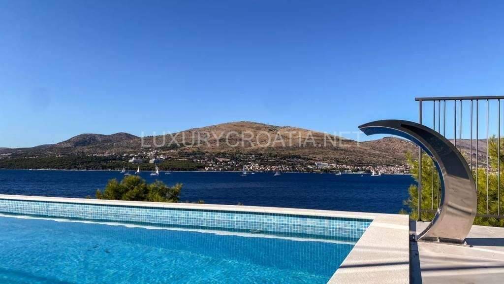 Die neue, moderne Villa am Meer in der Gegend von Trogir in Kroatien steht direkt am Wasser zum Verkauf. Es gibt keine Straße dazwischen.