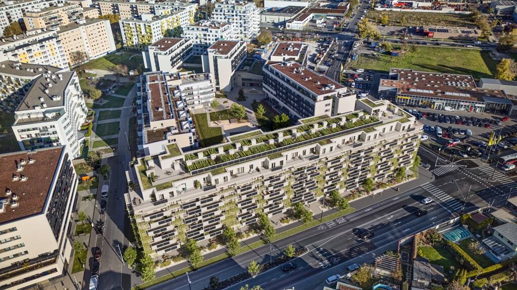 * großer Innenhof mit abwechslungsreichen Spielmöglichkeiten sorgt für Freizeitspaß direkt vor der Haustür. * Private Gartenbeete mit exklusivem Freibereich mit Outdoor Küche und Spielplatz auf dem Dach können optional erworben werden, genau wie Tiefgaragenplätze und private Fahrradabstellplätze - auch für Lastenfahrräder. * Angenehmes Wohnambiente mit großzügigen Verglasungen und bodentiefen Fenstern ermöglichen einen freien Blick. * Sicherheitseingangstüren * Echtholzboden Eiche geklebt * Tiefe Balkone und Terrassen vergrößern Ihre Wohnung ins Freie * Fix verbaute Split-Klimageräte in 60 Wohnungen, alle anderen Wohnungen sind mit Split-Klimageräten nachrüstbar. * Eine Fußbodenheizung mit Fernwärme sorgt für angenehme Wärme. * Außenliegende, elektrisch bedienbare Rollläden, alle Fenster mit 3-Scheiben-Isolierverglasung. * Balkon-Photovoltaik ("Balkonkraftwerk") mit direkter Strom-Einspeisung in Ihre Wohnung KomfortPlus. Ein rund 70 m² großer Fitnessraum mit Freibereich und ein Yoga Raum dienen gerne zum Abschalten vom stressigen Alltag. * 100 PKW-Stellplätze in der Tiefgarage - auch für Elektrofahrzeuge nachrüstbar. * Betreffend Küchenplanung stehen ihnen die Verkäufer sehr gerne beratend mit Beispielen zur Seite.