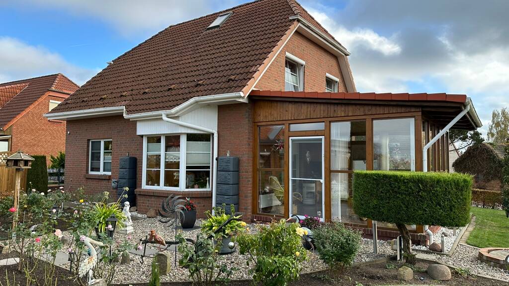 Hier erwerben Sie ein geklinkertes Einfamilienhaus auf einem weitläufigen und gepflegtem Anwesen mit liebevoll eingearbeiteten Details. Das Wohnhaus mit gehobener Ausstattung wurde 1995 mit 24 cm starken Kalksandsteinen gemauert, mit einer 80 mm Dämmung und Verklinkerung erbaut. Ein Wintergarten und ein Kamin tragen zu einer erholsamen Wohnatmosphäre bei. Das Bad ist mit Marmorfliesen ausgestattet. Das gepflegte Anwesen verfügt auch über einen Nutzgarten und ein Gewächshaus. Ca. 5.500 l Regenwasser können gespeichert und zur Bewässerung genutzt werden. Zwei Garagen und viel Nebengelass sorgen für Stauraum und vielfältige Nutzungsmöglichkeiten. Das 45 Grad geneigte Krüppelwalmdach ist mit Betondachsteinen eingedeckt und wärmegedämmt. Ins Obergeschoss gelangen Sie über eine 1/4 gewendelte Stahlhandlauftreppe mit aufmontierten Holzstufen. Eine Vaillant Gasbrenntherme aus dem Jahr 2021 befeuert die Zentralheizung. Im Bad wärmt zusätzlich ein Wandheizkörper. Auf dem Garagendach ist eine PV Anlage montiert, die in Spitzenzeiten bis zu 1,2 KW/h Leistung ins Netz einspeisen kann, bzw. einen guten Teil des Eigenbedarfs an Elektroenergie deckt.
