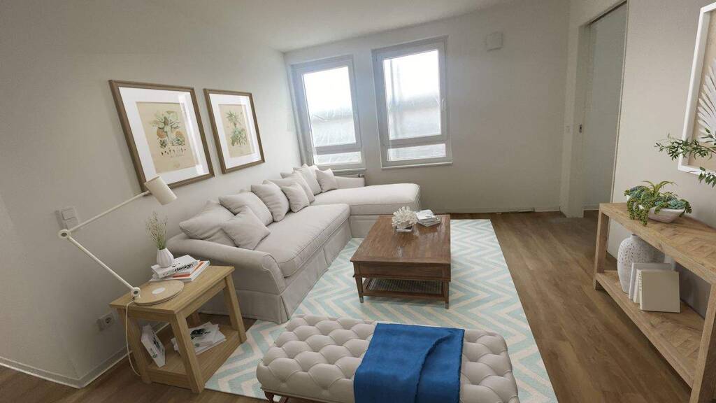 Ihre neue Wohnung erreichen Sie bequem zu Fuß oder mit dem Aufzug. Die lichtdurchfluteten Wohnräume sind mit einem hochwertigen Designboden in Eichenoptik ausgestattet.