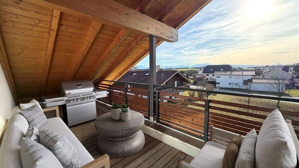 Ein besonderes Highlight ist die überdachte Dachterrasse mit Alpenblick. Sie erweitert den Wohnraum nach außen und bietet einen geschützten Bereich für ruhige Momente oder gesellige Abende.