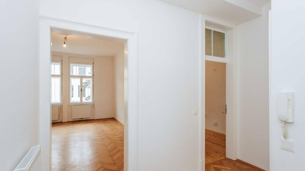 Fischgrät-Parkettböden, Kassettentüren, Wienerstockfenster, in der Küche Dielenboden. All diese Details und natürlich eine beeindruckende Raumhöhe von 3 Meter 30 unterstreichen den geschichtlichen Charakter dieser Wohnung.