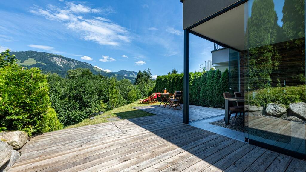 Dieses architektonische Highlight wurde in 2016 in einer idyllischen Waldrandlage in St. Johann errichtet und besticht durch eine äußerst gelungene Symbiose aus traditioneller Bauweise und modernen Elementen. Die hier angebotene Gartenwohnung, welche hochwertig ausgestattet wurde, bietet ein absolutes Wohlfühlambiente. Das Eigenheim mit knapp 65 m² reiner Wohnfläche bietet zwei Schlafzimmer, ein edel ausgestattetes Bad mit Wanne und Dusche, den Flur sowie ein Gäste WC. Das Highlight dieses trendigen Apartments ist sicherlich der offen gestaltete Wohn- / Essbereich mit ansprechendem Kamin und raumhohen Panoramafenstern, sowie den vor kurzem erst zusätzlich errichteten, knapp 10 m² großen, herrlichen Wintergarten. Im Außenbereich steht Ihnen eine traumhafte Sonnenterrasse samt angrenzendem 150 m² großen, terrassenförmig angelegtem Garten zur Verfügung. Hier können Sie zahlreiche Sonnenstunden sowie den fantastischen Bergblick genießen oder auch ein entspanntes Plätzchen unter den Bäumen finden, eine absolute Ruhe- & Naturoase.