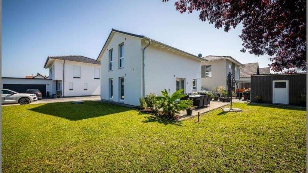 Dieser schicke Neubau von 2016 steht auf einem großen Eckgrundstück in einem verkehrsberuhigten und modernen Wohngebiet in Rheinau, Ortsteil Rheinbischofsheim. Rheinau liegt in der rheinischen Tiefebene und gehört zum Ortenaukreis im Regierungsbezirk Freiburg.