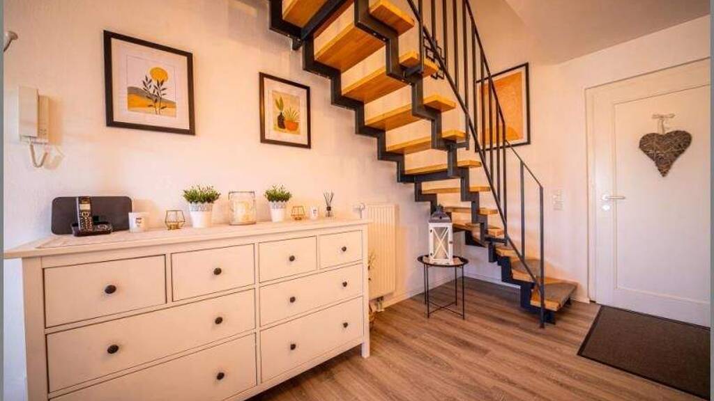 Die Räumlichkeiten sind sehr angenehm gestaltet und ausgestattet: Bodentiefe Fenster (mit Kurbel-Rollläden) und eine überwiegend weiße Farbgestaltung sorgen für viel Helligkeit. Die schlichten, matt-weißen Zimmertüren sind passend gewählt. Der einheitliche, sehr schöne Laminatboden in Holzoptik unterstreicht das insgesamt sehr wohnliche Ambiente.
