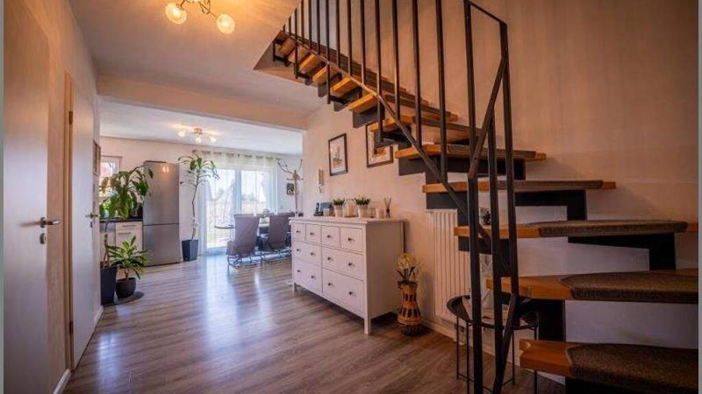 Im Erdgeschoss empfängt Sie eine geräumige, offene Diele und die schöne Holztreppe ins Dachgeschoss. Hier schließen sich links der Technikraum und ein Gäste-WC an. Geradeaus geht es in den Essbereich mit einer offenen Wohnküche, die mit einer schönen Einbauküche ausgestattet ist. Ein heller Wohnbereich schließt sich an. Von hier aus geht es in das erste von vier separaten Schlafzimmern.