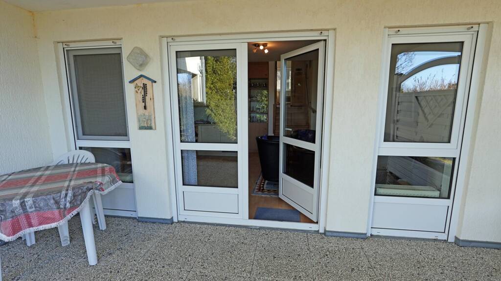 Über ein paar Stufen gelangt man in die untere Ebene der Wohnung, in dem sich der helle und offen gestaltete Wohn- und Essbereich befindet. Große Fensterflächen sorgen hier für viel Tageslicht und schaffen eine freundliche, einladende Wohnatmosphäre. Die integrierte Küchenzeile fügt sich harmonisch in den Raum ein und ermöglicht kurze Wege im Alltag. Vom Wohnbereich aus besteht direkter Zugang zur zugeordneten Terrasse, mit Süd-West-Ausrichtung, die zusätzlichen Raum im Freien bietet und sich ideal für entspannte Stunden an der frischen Ostseeluft eignet.