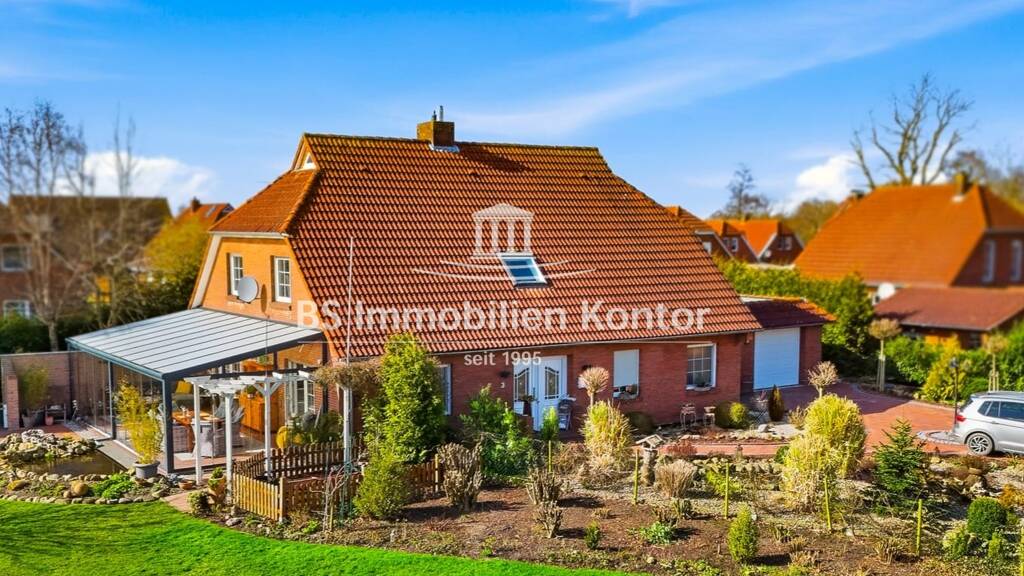 Dieses moderne Einfamilienhaus in ruhiger und zugleich idyllischer Wohnlage von Campen überzeugt durch seinen hervorragend gepflegten Zustand, eine durchdachte Raumaufteilung sowie eine hochwertige Ausstattung. Besonders hervorzuheben ist der freie Blick zum Nordseedeich, der ein tolles Wohngefühl in naturnaher Umgebung bietet. Die Immobilie wurde 1989 in konventioneller Massivbauweise mit einem Krüppelwalmdach erstellt und bietet mit einer Wohn- und Nutzfläche von ca. 200 qm ein komfortables Zuhause für anspruchsvolle Käufer. Helle, großzügig geschnittene, lichtdurchflutete Räume sowie ein ca. 40 qm großer, hochwertiger Sommergarten mit zugluftgeschützten Glaselementen und elektrischer Beschattung, schaffen eine besonders angenehme Wohnatmosphäre und ein modernes Wohngefühl mit Blick in die freie Natur. Dank der durchdachten Raumaufteilung ist zudem ebenerdiges Wohnen möglich, wodurch sich das Haus auch langfristig flexibel nutzen lässt. Der pflegeleichte Garten wurde mit Ziersträuchern, Pflanzen und einem liebevoll gestalteten, kleinen Gartenteich angelegt. Überzeugen Sie sich gerne selbst, in einer persönlichen Besichtigung, von den vielen Vorzügen dieser Immobilie. Die besondere Atmosphäre, die hochwertige Ausstattung und die bevorzugte Lage werden Ihnen gefallen.