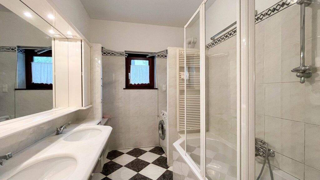 Die Aufteilung umfasst einen zentralen Vorraum mit Flur, ein Wohnzimmer und ein weiteres Zimmer mit Ausgang zur Loggia, ein zusätzlich flexibel nutzbares Zimmer, eine separate Küche mit Einbaugeräten, einen praktischen Schrankraum, ein Badezimmer mit Wanne und Waschmaschinenanschluss sowie ein separates WC. Ein Gemeinschaftsgarten steht allen Bewohnern zur Verfügung, ein Garagenstellplatz ist der Wohnung zugeordnet.