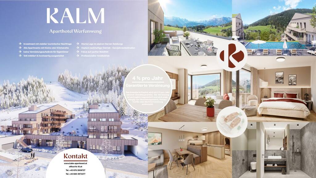 Hier einige kurze Informationen zur Immobilie: Stellen Sie sich einen Ort vor, an dem alpiner Charme, moderne Architektur und ein professionelles touristisches Konzept zu einer nachhaltigen Investmentchance verschmelzen. Mit dem Aparthotel KALM Werfenweng entsteht ein Projekt, das Urlaubsqualität, Komfort und Wertstabilität vereint: 40 voll ausgestattete Apartments, geführt nach einem zeitgemäßen Hotelbetriebskonzept - konsequent auf den touristischen Markt ausgerichtet. Eingebettet in die beeindruckende Bergwelt des Salzburger Landes erfüllt das Projekt höchste Ansprüche an Ausstattung, Design und Servicequalität. Vom Wellnessbereich und hauseigenen Restaurant über vielfältige Entertainment-Zonen bis hin zu durchdachten Grundrissen - jedes Detail ist darauf ausgelegt, Gästen besondere Momente zu bieten und Investor*innen ein stabiles, renditestarkes Investment zu ermöglichen. Ausstattung & Bauweise (Turnkey-Ready) Alle Apartments werden vollständig möbliert und löffelfertig übergeben - bereit für die sofortige touristische Vermietung.