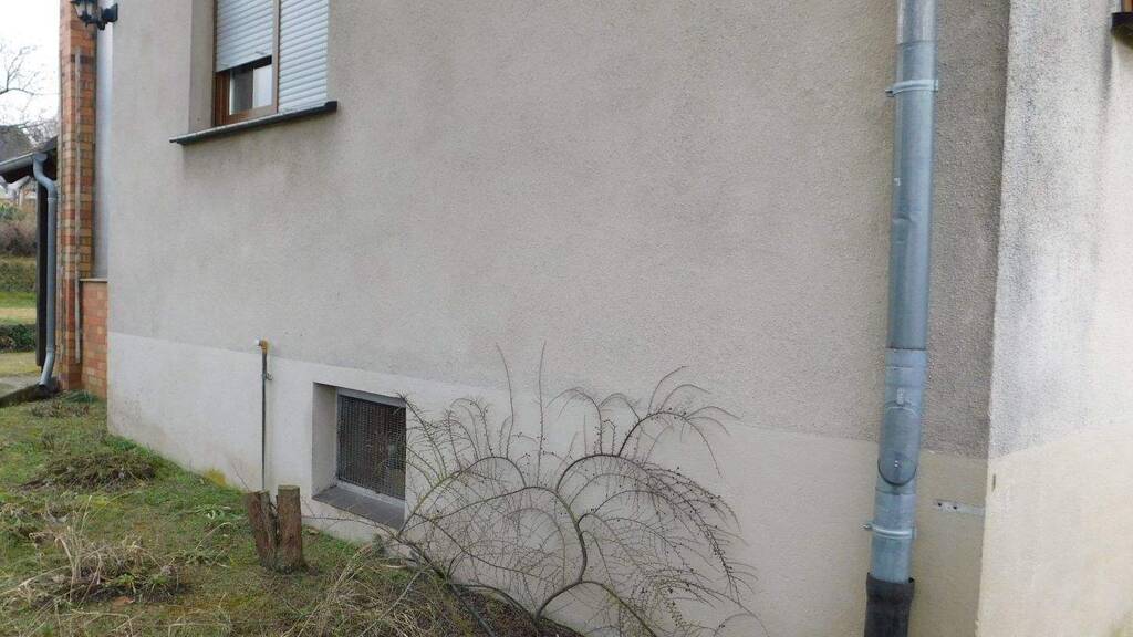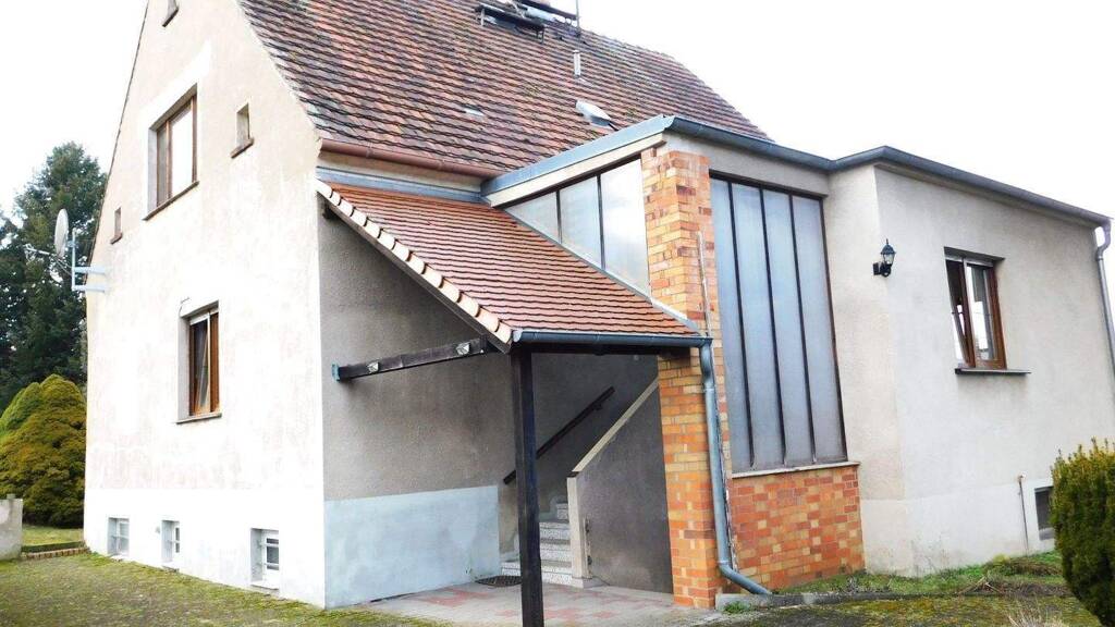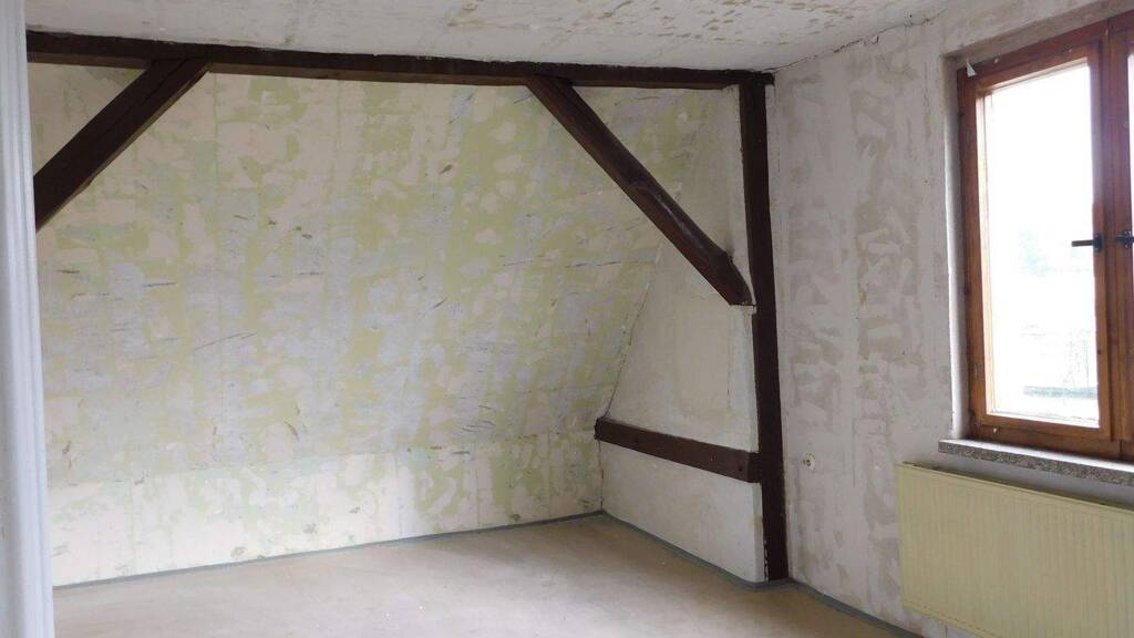 Das Einfamilienhaus in sehr solider Massivbauweise ist voll unterkellert. Eine im Jahr 1992 installierte Ölzentralheizung mit Öllager befindet sich im Keller, weiterhin eine Werkstatt, eine ehemalige Waschküche und zwei weitere Kellerräume. Das Kellergeschoss ist zusätzlich von außen begehbar. Im Erdgeschoss befinden sich hinter einer geräumigen Eingangsveranda ein Flur, ein Bad mit großer Dusche, das Wohnzimmer, eine große Küche und ein weiteres Zimmer. Über eine Treppe mit Massivholzstufen gelangt in das Dachgeschoss; hier befinden sich zwei weitere Zimmer und ein WC mit Waschtisch. Die Räume im Erdgeschoss und auch im Dachgeschoss verfügen über eine sehr komfortable Raumhöhe von ca. 2,60 m.