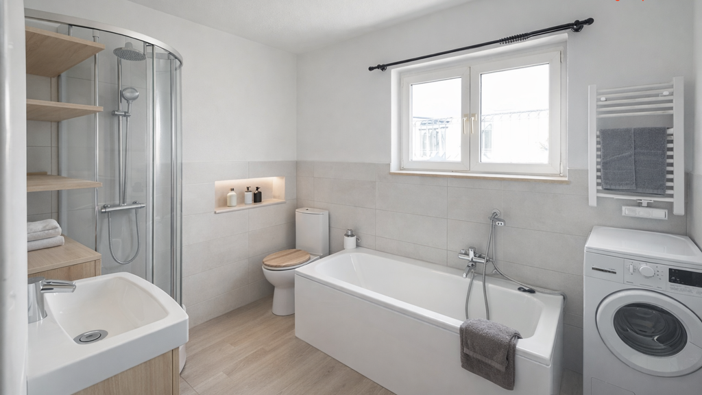 • Bad: gefliestes Bad mit Dusche und Wanne