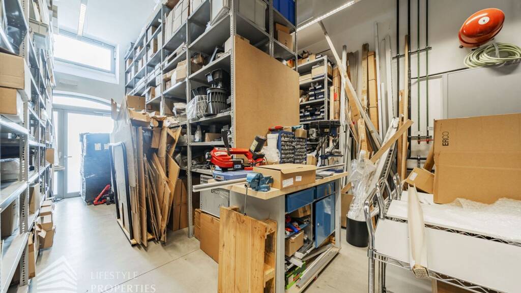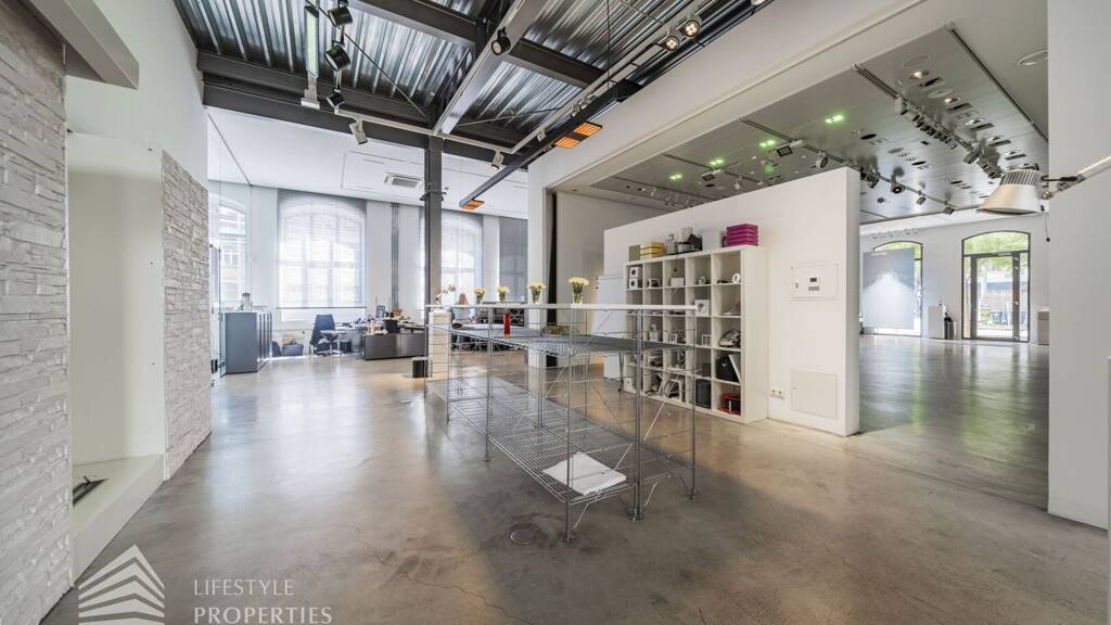 Die Verkaufsfläche zeichnet sich durch die offene Raumgestaltung aus. Viele große Fenster versorgen die Räumlichkeiten mit viel Licht, wodurch die Waren in bestem Licht präsentiert werden. Die Küche ist mit modernen Geräten ausgestattet und verfügt über ausreichend Stauraum.