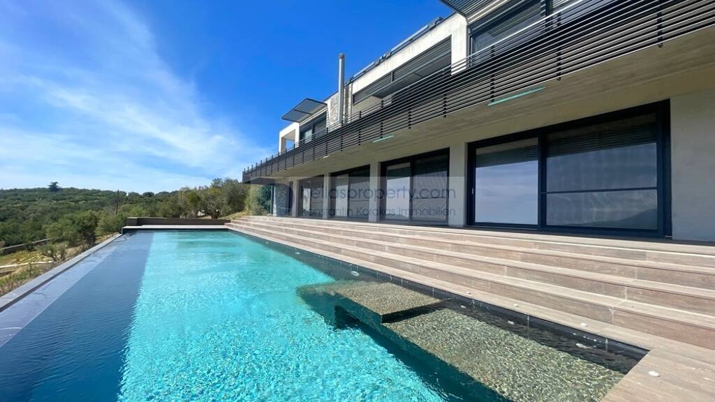 In der kosmopolitischen Jalova nahe Pylos befindet sich diese neuwertige und extravagante Villa mit 450 m² Wfohn-/Nutzfläche, mit besonderem Baustil.
