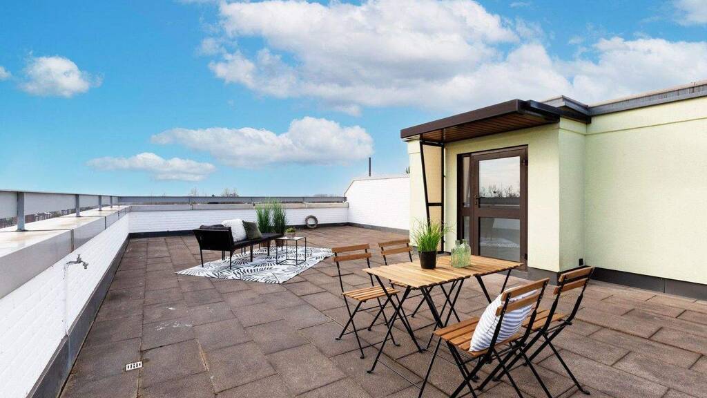 Über eine innenliegende Treppe gelangen Sie direkt von der Wohnung auf Ihre eigene Dachterrasse - ein Rückzugsort mit viel Privatsphäre und ohne Einblicke von Nachbarn. Hier genießen Sie Sonne, Weitblick und absolute Ruhe.