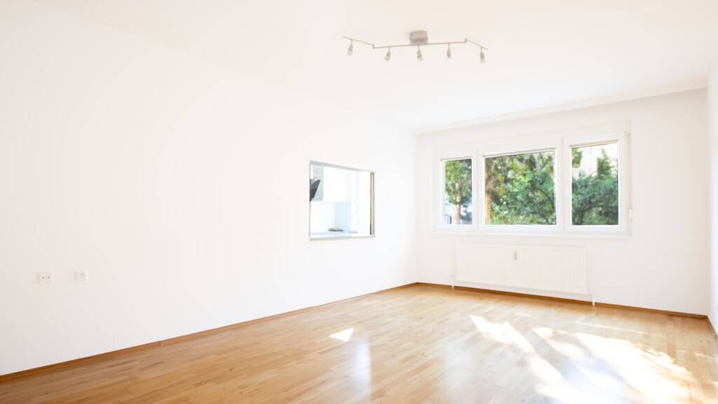 Das großzügige Wohn- Esszimmer bildet das Herzstück der Wohnung und besticht durch seine Helligkeit und angenehme Wohnqualität. Die beiden weiteren Zimmer- ein Schlafzimmer, sowie ein Kinderzimmer oder Büro, sind ruhig zur Rückseite der Anlage ausgerichtet und bieten einen schönen Blick ins Grüne. Die moderne, neuwertige Küche ist mit hochwertigen Markengeräten, sowie einem großen Kühlschrank ausgestattet und lässt keine Wünsche offen. Besonders praktisch und zugleich kommunikativ ist die Durchreiche ins Wohnzimmer, die den Alltag erleichtert und sich ideal beim Bewirten von Gästen eignet. Abgerundet wird das Raumangebot durch eine stilvoll gestaltete Garderobe mit ausreichend Stauraum. Die Wohnung wurde vor kurzem renoviert und ist sofort beziehbar. Neue Fenster sowie Sonnenschutzrollos sorgen zusätzlich für Komfort und ein angenehmes Wohnklima.