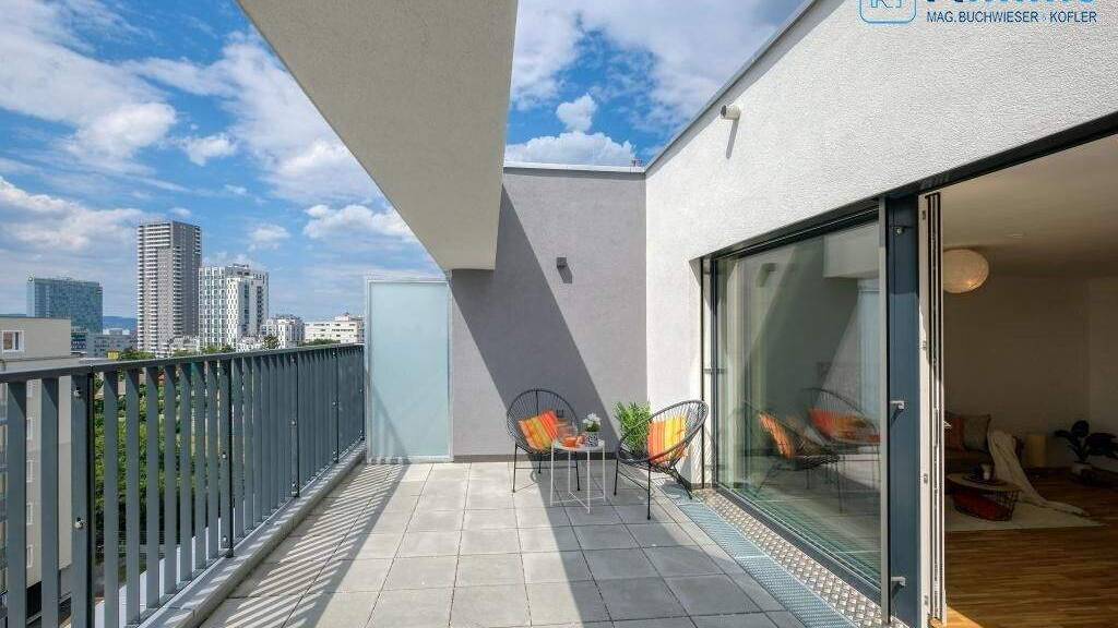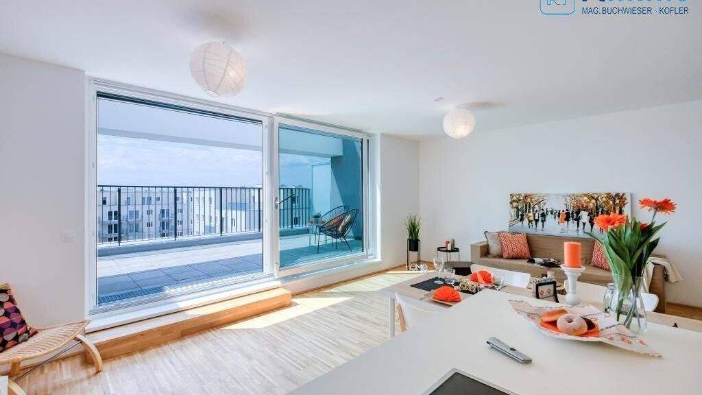 Diese neuwertige schöne Dachterrassenwohnung mit Fernblick besticht durch die große Terrasse, die von allen Zimmer begehbar ist und Sie die Abendsonne genießen lässt. Die Helligkeit der großen Terrassentüren macht diese Wohnung besonders lebenswert, zusätzlich zu der Aircondition, die einen kühlen Sommer garantiert. Von der Terrasse haben Sie einen tollen Blick bis zum Schneeberg und Rax sowie auf die Generali Arena, und natürlich im Norden der traumhafte Blick über Wien. Die Wohnung ist perfekt aufgeteilt und bietet zusätzlich zum großen Wohnesszimmer mit den 2 Schlafzimmer viel Platz. Das hochwertig ausgeführte Badezimmer und eine geschmackvolle Küche machen die Wohnung zum perfekten zu Hause.