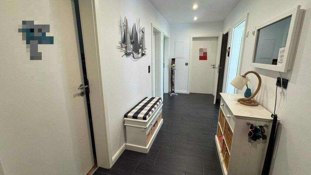 Der anthrazit geflieste Flur stellt den zentralen Eingangsbereich zur Wohnung dar. Hier finden Kommode, Garderobe und eine Sitzbank seinen Platz.