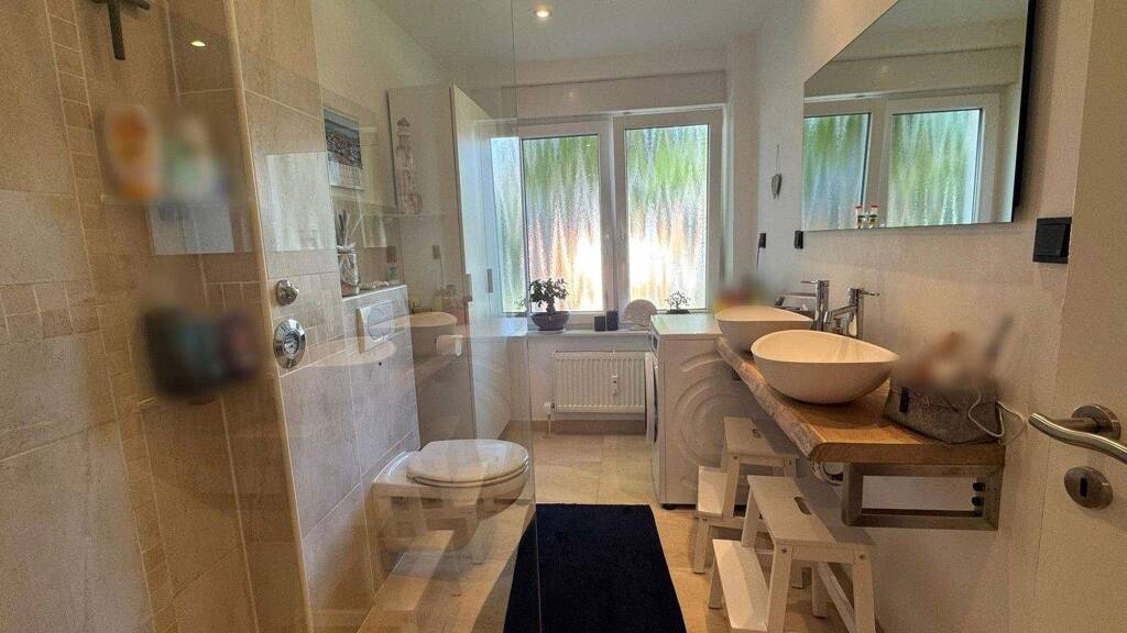 Das Badezimmer verfügt über WC, Waschmaschinenanschluss und zwei einzelne Waschbecken auf einem Echtholz-Waschtisch aus Eiche. Darüber hinaus eine ebenerdige Regendusche mit Glastrennwand.