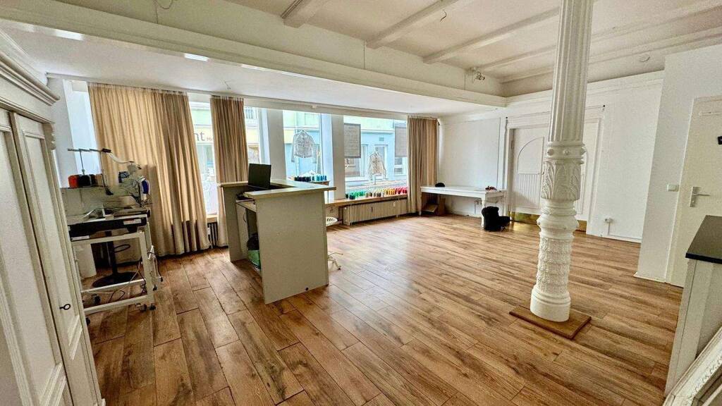 Die Fläche überzeugt durch einen großzügigen,offenen Raum mit charaktervollen Holzdielen und einer markanten Säule, die dem Objekt besonderen Charme verleiht. Eine große Fensterfront sorgt für eine freundliche, lichtdurchflutete Atmospähre und bietet ideale Präsentationsmöglichkeiten.