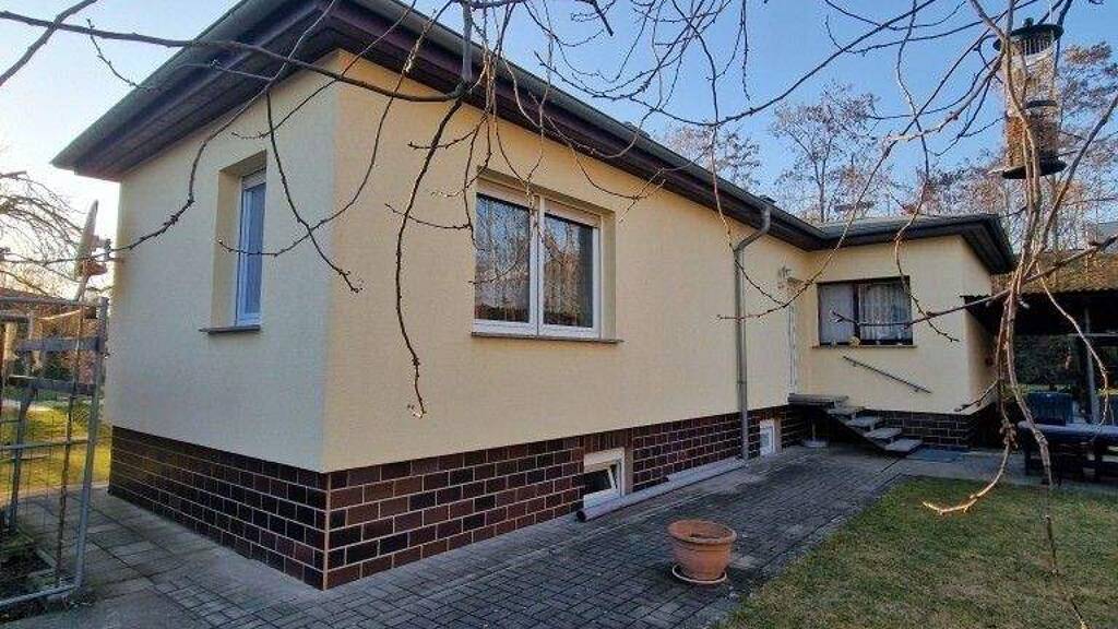 Dieser Winkelbungalow in einer schmucken Einfamilienhaussiedlung am Südrand der Großen Kreisstadt Delitzsch ist in Etappen entstanden. Zunächst wurde im Jahr 1987 der hintere Teil als kleines Einfamilienhaus errichtet und später im Jahre 1997 das Wohnhaus durch einen Anbau vergrößert. Dadurch wurde die Wohnfläche auf das Erdgeschoss begrenzt und das Kellergeschoss weitgehend als Lager- und Heizfläche genutzt. Das Wohnhaus wurde massiv errichtet, die Außenwände mit einer Wärmedämmfassade versehen. Die Fenster im Neubau sind aus Kunststoff mit 2-Scheibenverglasung, die Fenster im Altbau sind Holzverbundfenster. Das Pultdach ist ein Holzbalkendach mit Bitumenbahnen gedeckt und innen mit Wärmedämmung versehen. Die Elektrik ist komplett erneuert. Die Beheizung erfolgt mit einem kombinierten Öl- und Holzbrennkessel mit Warmwasseraufbereitung. Das geräumige Bad hat Wanne und Dusche sowie einen Waschmaschinenanschluss. Die große Garage ( ca. 35m² ) lässt auch Platz für den Camper oder einen Werkstattbereich. Den großen Gartenbereich können Sie individuell gestalten, für die Bewässerung sind ein Brunnen sowie 2 Zisternen vorhanden. Eine kleine Fläche vor dem Grundstück mit ca. 33 m² wurde von der Stadt hinzugepachtet.