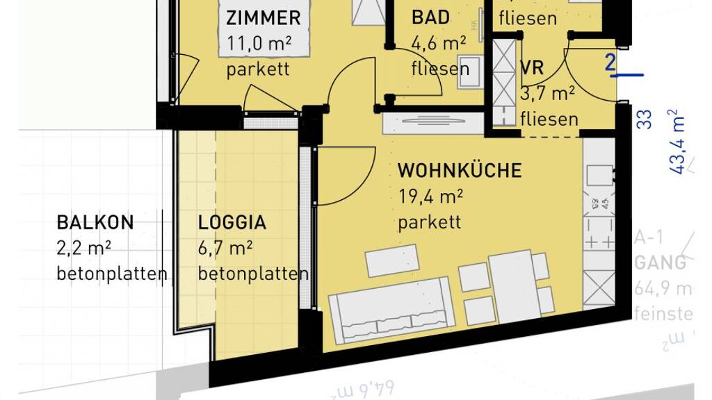 2 Zimmer  •  43,4 m²  •  1. Geschoss  •  frei ab 30.06.2028